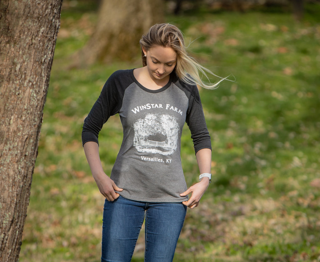 Show your WinStar spirit with this 3/4 sleeve baseball tee featuring a print of WinStar's easily recognizable farm gates!