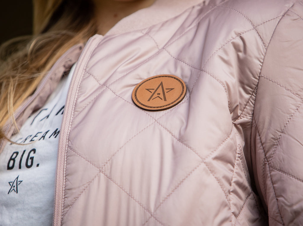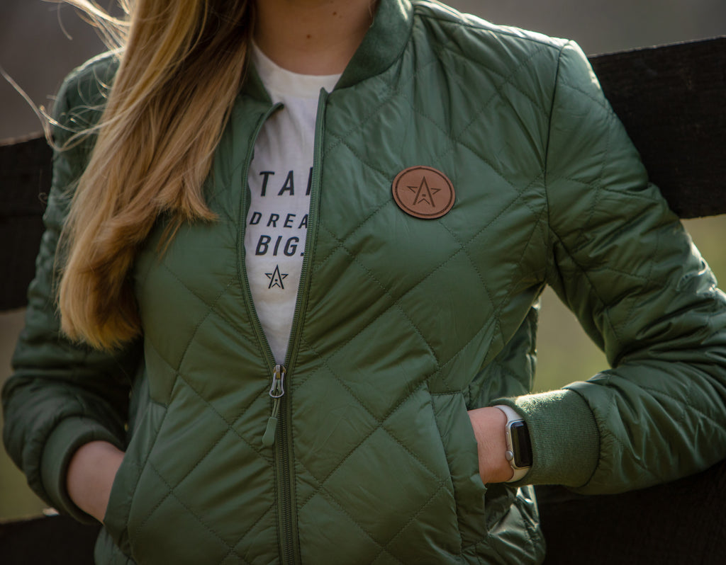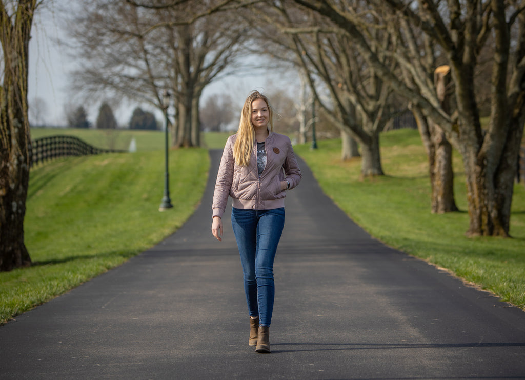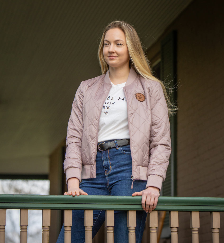 Womens' packable bomber jacket with a subtle WinStar Farm logo leather patch. Comes in two easily-styled colors and is the perfect weight for cooler temperatures!